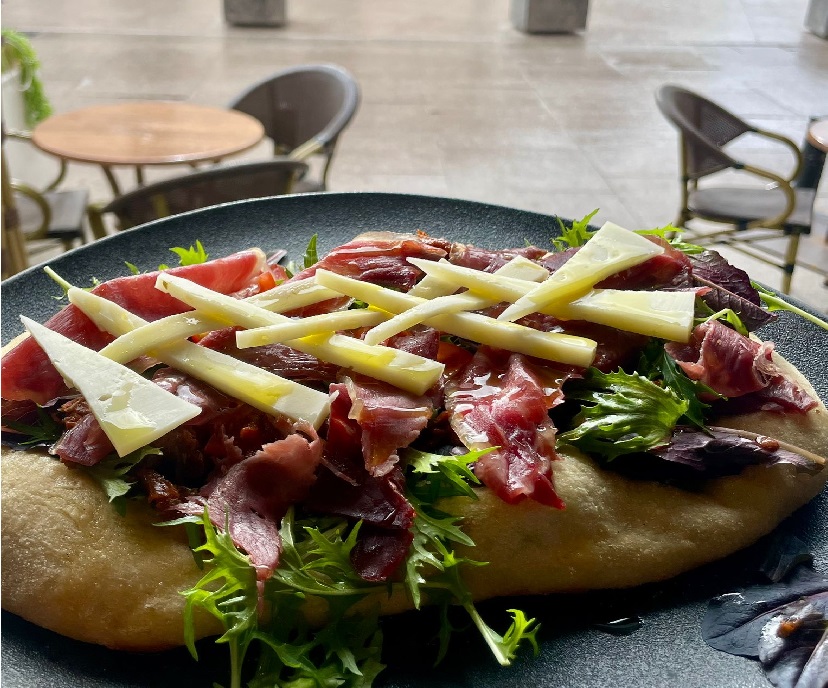 Pinsa Ibérica, nuestra masa artesanal con 24h-72h y combinación de 3 harinas Trigo, SOJA, arroz. Acompañada de brotes verdes, tomate seco, cherrys , queso curado, jamón ibérico y AOVE.