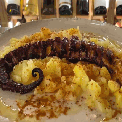 Tierno pulpo gallego, acompañado de fino pure de patata panadera, pimentón de la vera, escamas de Sal y AOVE.