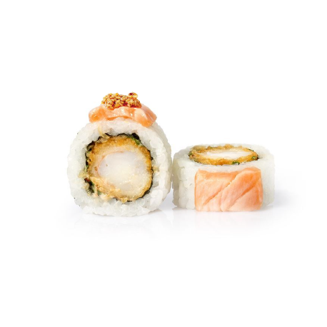 Relleno de langostino en panko, cubierto desalmón Grillado y Salsa de Sésamo.